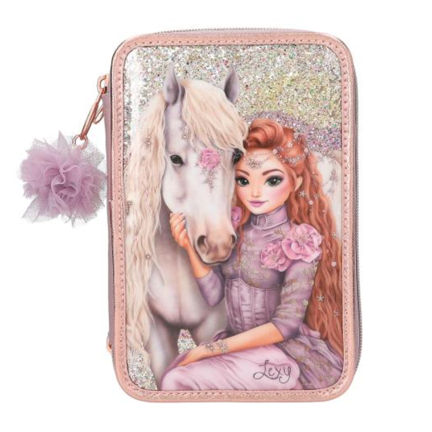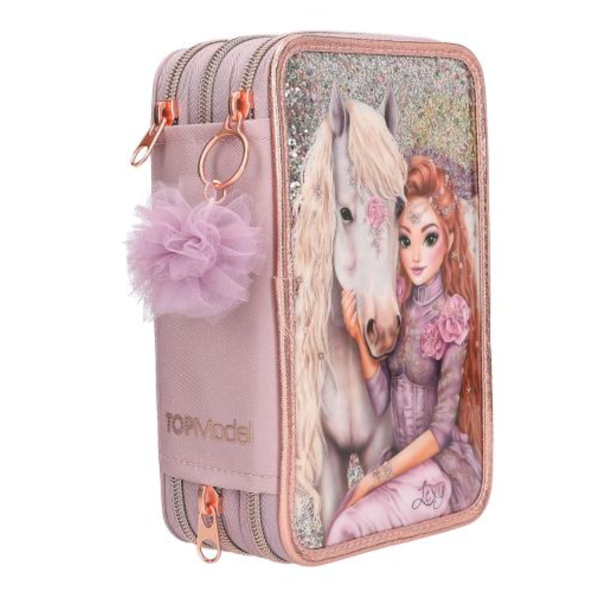 Viva Violet: The TOPModel pencil case in muted purple has a large model motif with a beautiful horse on the glittering front. A fancy, flowery tulle pendant dangles from the zip. The three separate compartments are each completely filled with 18 colouring and felt-tip pens, 2 pencils, eraser, sharpener, ruler, scissors, glue stick and a small velcro pouch. Material: 100 per cent PES; PVC on the front