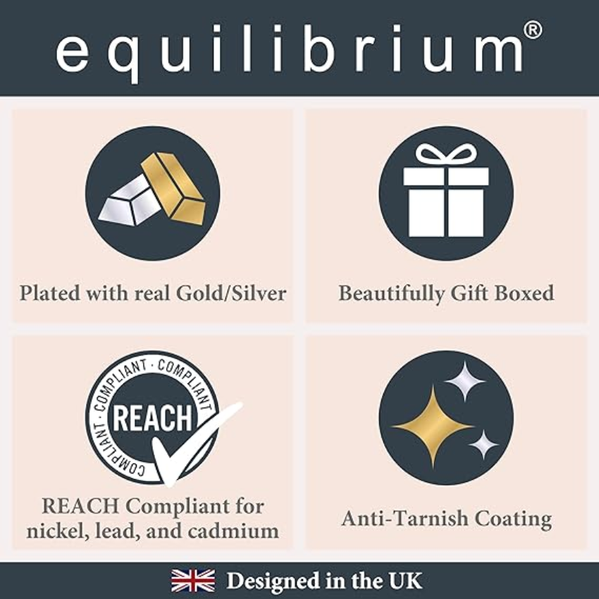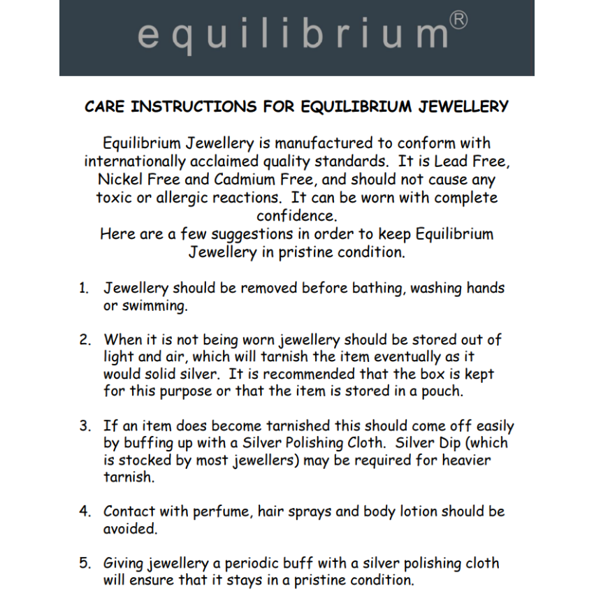 Equilibrium Jewellery is designed in the UK and follows internationally acclaimed quality standards. The jewellery is lead-free, nickel-free and cadmium-free and should not cause allergic reactions.