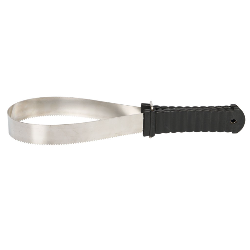 Stainless steel blade with teeth on one side and plastic handles. The ridged side is useful for removing loose hair particularly at the change of seasons, while the smooth side is a very effective sweat scraper.